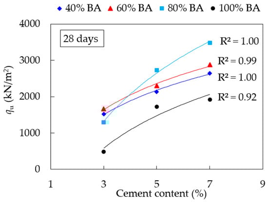 Relationship between qu and cement content at 28 days of curing time.