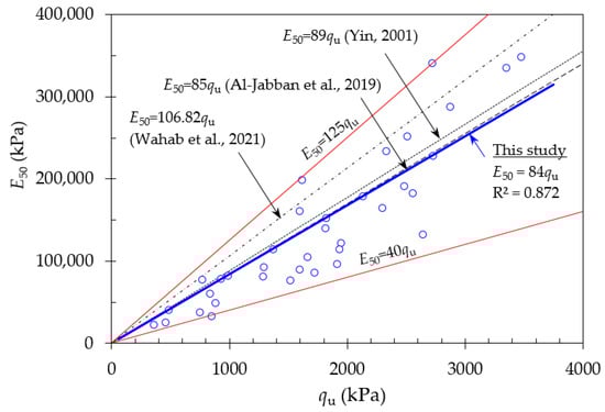 The secant modulus (E50) obtained from the stress-strain curve was used to explain the stiffness of the CSS specimens. Figure 10 shows the relationship between the E50 and qu values of the CSS specimens (i.e., 3, 5, and 7% cement contents) at 7, 14, and 28 days of the curing time. Regarding Figure 10, the E50 increased linearly with an increase in the qu value, which was varied from 40qu to 125qu (i.e., red line in Figure 10) with the best fitting line of 84qu and the R2 of 0.872. It can be seen that the obtained E50-qu correlation from this study was consistent with the previous studies. For example, it was slightly lower than 106.82qu for the cemented-lateritic soil in Malaysia which was presented by Wahab et al. []. Similar results were reported by Al-Jabban et al. [] for the cement-treated sandy clayey silt in Sweden (i.e., 85qu) and Yin [] for the cement-treated Hong Kong marine deposit (i.e., 89qu). Therefore, it is suggested that the relationship between E50 and qu obtained from this study can be reliable in utilization in road pavement applications.