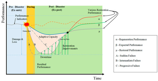 The performance of infrastructure can be dropped to a level lower than the targeted level or the preperformance level (β line) immediately after a disaster. The failure can occur in terms of functionality and serviceability as a sudden or progressive failure depends on the disaster intensity and the resilience to that disaster event (A, B, and C). The restoration performance of the infrastructure can be expected at different levels such as restored performance (α), expected performance (β), and regeneration performance (µ-higher performance than expected). The resilience of a critical infrastructure can be assessed with the key performance indicators such as functionality and serviceability. [49].