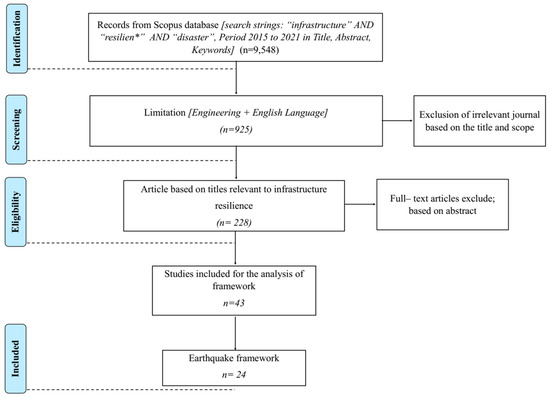 Step 4: Inclusion stage—By analysing the abstracts and conclusion sections, 43 articles were included (refer Supplementary Tables S3 and S4) for detailed content analysis to critically review the frameworks developed for assessing infrastructure resilience in disaster management. Among those articles, 24 studies were finally selected for critical review that focused on earthquake-hazard-specific infrastructure resilience assessment as shown in Table 1 (full details are given in Supplementary Table S5). The aim of this study is to analyse each of the 24 frameworks in detail as opposed to some reviews that aim to provide a macroview of the selected papers such as [63,64].