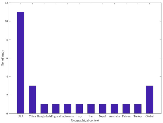 Most of the frameworks evaluated in this study were developed with a specific geographic focus, such as regional frameworks, rural/urban resilience frameworks, community frameworks, and coastal resilience frameworks. Figure 6 illustrates the number of frameworks developed in each country. Notably, a large number of frameworks (11) were developed with the focus on the United States of America (USA), whereas 3 among the 24 frameworks were general without any specific geographic focus.