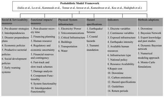 Figure 8 shows the key features of infrastructure resilience assessment frameworks developed using probabilistic models. The social/serviceability measures primarily focused on policies, early warning systems, disaster preparedness, and interdependencies, whereas the functionality measures focused on human resources, socioeconomic factors, damage analysis, and sustainability concerns. Discrete and continuous variables were used to analyse the downtime of power and telecommunication by Iuliis et al. [27] (Discrete variable is defined as the finite number such as earthquake intensity, and continuous variable is defined as the infinite element such as exposed structures and infrastructure types).