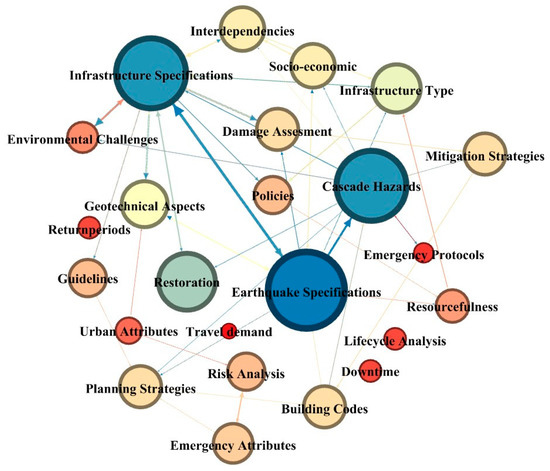 As shown in Figure 10, the size of the circle denotes the scalar values of the indicators used in the study [98]. It is also necessary to define the connections between the elements required for the analysis, as well as their characteristics in terms of direction and weight [92]. In this study, the mixed method of analysis was selected to evaluate correlations between critical infrastructure [86]. Moreover, a variable can be categorised as directed or undirected based on the graph theory [92]. The majority of the frameworks prioritised infrastructure specifications such as building type, number of stories in buildings, and distribution components in power infrastructure (e.g., distribution circuits and pole distribution) as well as seismic specifications such as seismic intensity, seismic cycling, and wave arrival time. In terms of connectivity in the analysis, the interdependencies are connected to infrastructure specifications, cascading hazards, socioeconomic factors, and infrastructure type (e.g., water networks, power networks, and transportation networks). Moreover, the indicators utilised in this study can help analyse various types of critical infrastructure as stated in the novel and adaptive framework (see Figure 11). The water network infrastructure can be analysed in different attributes: national guidelines and policies, geotechnical aspects (e.g., soil parameters), damage assessment (e.g., corrosion), interdependencies, specification of infrastructure (e.g., pipe diameter, distribution network, etc..), and emergency attributes (e.g., availability of water resources).
