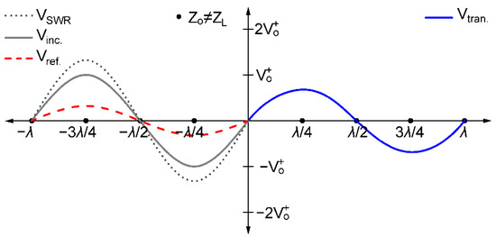Transverse electromagnetic wave characteristics of a transmission line at an instant time for impedance mismatch. The voltage standing wave (VSWR) is formed due to the superposition between the incident (Vinc.) and reflected (Vref.) waves, while the transmitted (Vtran.) wave amplitude is reduced.
