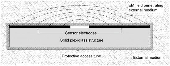 Cross section of sensor components and electromagnetic field generated between electrodes. The generated field generated between the two electrodes is expected to penetrate the external medium.