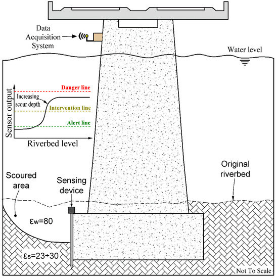 An indicative conceptual application of the scour sensor is presented in Figure 3 alongside the typical sensor response that is anticipated during scour evolution around the bridge foundation. During the scouring process, the original riverbed (εs = 23–30) will be gradually substituted by water (εw = 80) conditions. This change in the medium permittivity conditions will cause an increase in the sensor signal, which will indicate a corresponding increase in the scour depth around the sensor location. The sensing system can be coupled by an early warning system in which the signal is transmitted through the data acquisition system to structure maintainer/asset owner. Critical threshold levels can be determined so the scour sensor is able to exceed certain pre-defined values indicating the alert, intervention and danger lines (see Figure 3). This will allow precautionary actions to be carried out increasing safety and reducing bridge maintenance/rehabilitation costs.