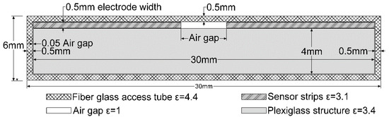 With regard to the inner cross section, a solid rectangular was simulated as this is expected to add durability for field application purposes and at the same time is anticipated to weaken the external field penetration. The simulated inner cross section therefore comprised of a solid plexiglass structure attached to two mirrored strip electrodes. The permittivity values assigned in the model are presented in Figure 4. A fiberglass access tube was also deemed to be necessary to add durability and resilience of the system to external environmental conditions and was included in the simulations to investigate its effect on the computed capacitance and its influence on the sensitivity of the sensor. An air gap between sensor electrodes was also simulated to investigate the effect of air into the computed capacitance.
