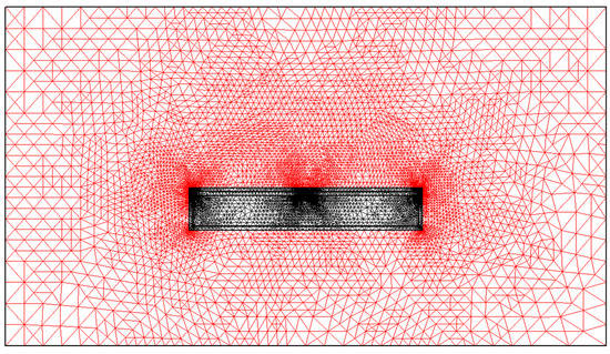 The model solver set-up was adjusted to 10% refinement per pass with 10 requested passes, while the error was set to 0.01% to enable us to capture in detail field characteristics into the areas of interest (i.e., next to strip electrodes). The generated typical mesh for simulated water conditions is shown in Figure 5.