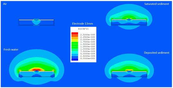 Typical magD values obtained for an electrode length of 13 mm and different simulated environmental conditions are presented in Figure 6. It is observed that in air condition, the electrostatic field that is generated between the sensor electrodes passes more readily through the dielectric material of the inner cross section and hardly penetrates the medium outside the access tube. This is attributed to the greater permittivity value of the plexiglass structure when compared to external simulated air environment. The magD and penetration area are significantly increased in the other simulated conditions with an electric field that has a good circular symmetry being generated between the sensor electrodes. The maximum magD is obtained in water environment, while greater strength of electric field is also recorded in deposited sediment compared to saturated sediment conditions. For all simulated models, the maximum magD that is generated between the transmitter and receiver electrodes was observed for the region that corresponds to the edge of the electrodes.