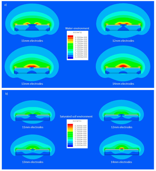 Figure 7a,b show the variation of the magD obtained for different simulated electrode lengths in water conditions and saturated soil conditions, respectively. The obtained results also indicate that an increase in the electrode length resulted to an increase in both magnitude of the electric flux density and penetration area of the field into the surrounding external medium. Greater magD is obtained for increased electrode size with a maximum value of 2.5 × 10−8 C/m2 recorded for electrode length of 14 mm in water conditions (see Figure 7a). The maximum strength of the electric flux density in the simulated saturated soil environment is also obtained for the maximum electrode arc length of 14 mm, which corresponds to 2.25 × 10−8 C/m2 (see Figure 7b). Maximum penetration of the simulated electric field is also observed to be achieved for the conditions that corresponded to water environment and for increased electrode lengths.