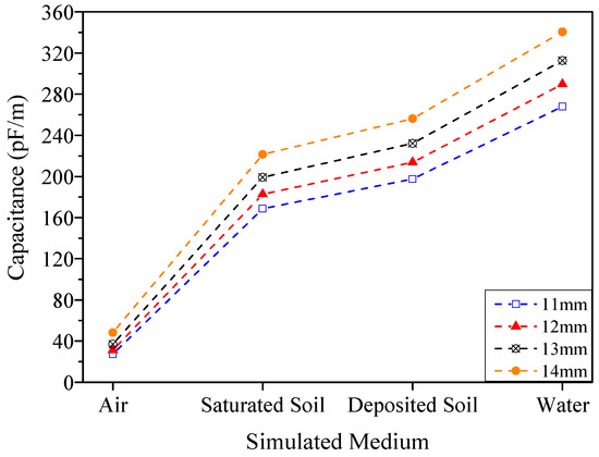 The maximum capacitance value of 340 pF/m corresponded to water conditions for electrodes with length of 14 mm, following a decrease to 256 pF/m and 221 pF/m in deposited and saturated soil conditions, respectively.
