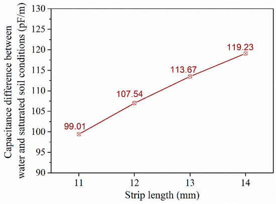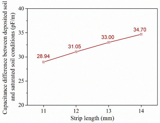 The capacitance difference between deposited and saturated soil is presented in Figure 10. A nearly linear increase is also observed with the capacitance different for electrode length of 11 mm to be recorded at 28.95 pF/m and to further increase by 7.3%, 14% and 20.1% for electrode sizes of 12 mm, 13 mm, and 14 mm, respectively.