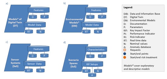 Data and information base (DIB) of the proposed resilience management: (a) the digital twin models, (b) environmental models, (c) sensor systems, and (d) scenario spaces.