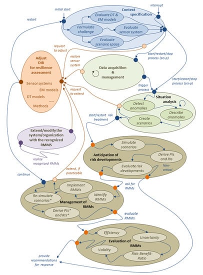 The task “Context specification” provides the evaluation of the framework employed for the resilience management of the CISO under consideration of new or modified challenges on the CISO (blue circle in Figure 2). It is executed whenever changes occur in the CISO, in the environment, or in the requirements of the CISO. Changes can be intentional, e.g., modernization, automation, new standards, and regulations, or quite unexpected, e.g., increased wear out of components, limited supplies, economic embargos. The implementation of such changes is executed in the task “Adjust DIB for resilience assessment”, which administrates the adaptation of the employed models (DT, EM), the sensor system, and the applicable scenario spaces (orange circle in Figure 2). This task, which is usually implemented with the help of external service providers, can be initiated by all other tasks with the exception of “Evaluation of Risk Mitigation Measures (RMM)” and “Anticipation of risk developments”.