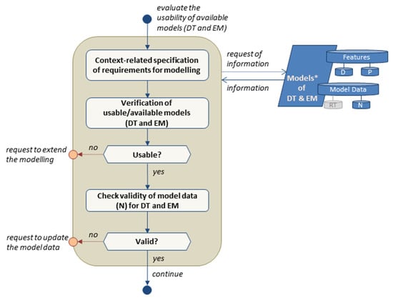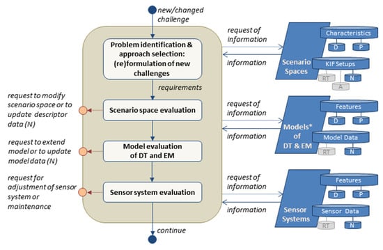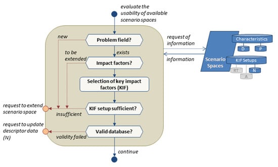 Next, the key impact factors (KIF) are selected, e.g., by cross-impact analysis, if the available scenario space supports large numbers of interdependent impact factors of interest. In the following step, the relevant KIFs are checked for sufficient description of all scenarios within the scenario space, e.g., relevant changes in climate or weather conditions, terrorist attacks, or functional failures. Additionally, the KIFs should sufficiently be parametrized according to related variables and parameters of the used models of the system and environment. The description should also include the time-dependent trend of the KIFs for the purpose of scenario development prognosis. An insufficient setup of KIFs leads to process termination and the request for a scenario space extension. Finally, it is checked if a valid database of nominal KIF values (N) representing the nominal state of the system is already provided. If validity is given, the subprocess finishes, and the task continues with the model evaluation of the used digital twin (DT) and environmental models (EM) (see Figure 5). Otherwise, new descriptor data are requested.