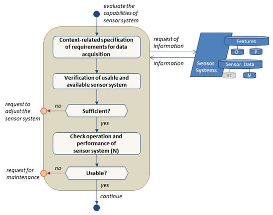 The fulfillment of requirements is evaluated by a two-step checking of the sensor system. In the first step, the sensor system is analyzed, considering its ability to provide the data and information as needed. In case of a negative outcome, the modification of the sensor system is requested. Next, the operability and capability of the sensors system, e.g., in terms of quality of data provision, is verified, and, if necessary, maintenance is requested.