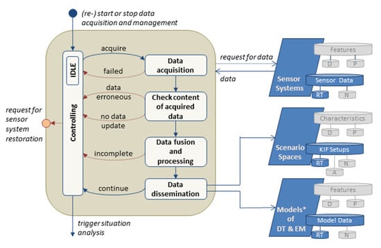 The task “Data acquisition and management” serves the monitoring of the considered CISO and its relevant environment in compliance with the specified requirements (Figure 7). Its purpose is the retrieval of data and information needed for the parallel task “Situation analysis”. The task starts with the acquisition of the sensor system. Next, the formal requirements on the data provided, such as compliance with the data format, plausible data content, and availability of validity information, are verified. Failed data acquisitions, as well as violations of formal requirements, are reported to the control system, which ultimately decides whether data acquisition should continue or restoring measures are required for the sensor system.
