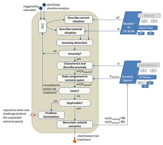 Next, anomalies are detected by comparing the current and nominal situations. The current and the nominal situation may also include the analysis of time series to determine parameters that describe trends as well as to detect abnormal changes. In principle, various methods are applicable for comparing and evaluating the situation in order to detect anomalies. For example, outlier detection may be a suitable mean for the time-efficient detection of relevant deviations [,]. In comparison, the recognition of known and unknown patterns in incoming data indicating abnormal behavior may be conducted by AI-driven processes [,]. The choice of comparison methods depends on the type and complexity of the data used as well as the resilience management objectives. Additionally, the comparison results should provide the details needed for the following state assignment in the scenario space. If no anomaly is detected, e.g., the current situation of DM and EM is within the boundaries of the nominal behavior, the process situation analysis switches back into an idle state, waiting to be triggered for a restart by new incoming data.
