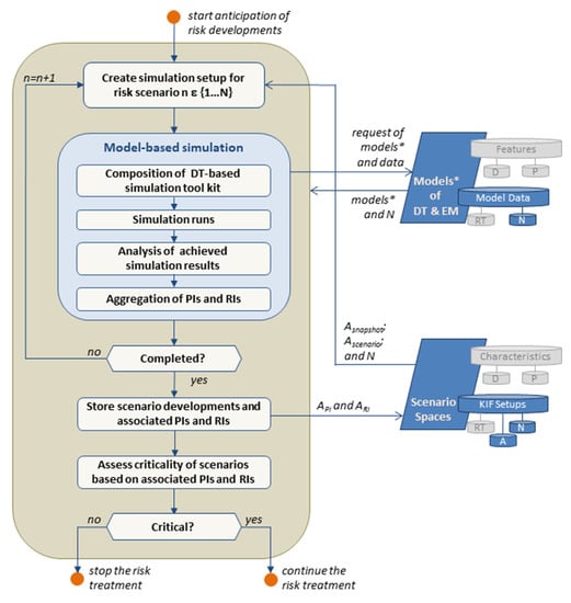 In general, DT and EM are composed of descriptive and predictive models. Descriptive models ensure that the diversity of components and aspects is sufficiently depicted. These models describe the system’s behavior based on historical as well as actual data and information []. Predictive models are able to explain changes based on causes, dependencies, and interactions. Hence, these models enable the investigation of “what will happen” and “what should be done to make or to avoid it happening” []. However, the consequent complexity of predictive models is significantly higher compared to descriptive models. Descriptive as well as predictive models should reflect the current state and behavior of the CISO and environment, including intrinsic interactions, through appropriate model parameterization and real-time monitoring of the model parameters (MPRT). Furthermore, the nominal behavior should be characterized by nominal values for the model parameters (MPN).