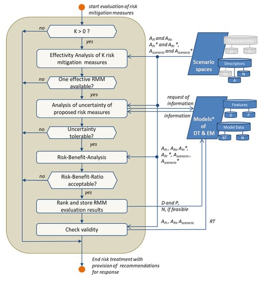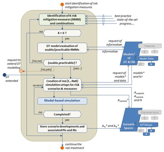 Similar to the generic resilience management process proposed by Häring et al. [], the resilience assessment is carried out with the help of the three consecutively executed tasks (beige circles in Figure 2). However, in the proposed scheme, the emphasis of the tasks is again on the actual operability of resilience management. The task “Anticipation of risk developments” focuses on the anticipation of potential risk developments with the help of scenario analysis. A possible outcome of this analysis might be that the determined risk is tolerable, and therefore the risk assessment is terminated. If this is not the case, the task “Management of Risk Mitigation Measures (RMM)” is initiated, which identifies possible approaches for risk mitigation. Therefore, the identified RMM are implemented in a simulation setup in order to determine corresponding performance and risk indicators []. This task can be interrupted when required modifications of the data and information base are required, which will be detailed in subSection 4.5. The consecutive task “Evaluation of Risk Mitigation Measures (RMM)” serves the evaluation of the proposed RMM and supports the decision-making considering efficiency, uncertainties, and risk–benefit ratios. The obtained results are then handed as decision support to the operator or other stakeholders. Proposed and chosen risk mitigation approaches should be stored to enable a posterior analysis of the effectiveness in practice and implementation quality.