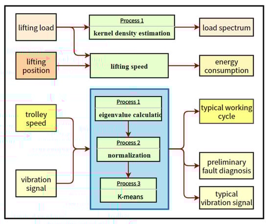 For the crane lifting load, lifting position, trolley speed and vibration signal of the gearbox collected at the port, this article proposes a data mining framework, as shown in Figure 3. The specific methods are: firstly, the crane load spectrum is obtained by statistically estimating the crane lifting load through a non-parametric kernel density estimation algorithm and the power under different loads can also be calculated; secondly, by drawing on the typical driving cycle construction problem in the transportation field, the eigenvalues of the trolley speed on the crane are calculated, and the typical working cycle is obtained through the k-means algorithm; finally, for the vibration signal of the gearbox, its time-domain and frequency-domain eigenvalues are calculated, and the k-means algorithm is used for unsupervised fault diagnosis of the gearbox; its clustering center can also represent the vibration data over a period of time and be retained as typical data for a long time.