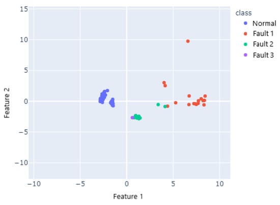 Ten faulty samples were selected from each of the three groups of faulty data, in addition to 30 samples from each of the three corresponding groups of normal data to form a total data set of 90. When the final number of clusters is set to 4, the number of samples in each category is 60, 17, 12 and 1, as shown in Figure 10. Among them, 60 normal data are identified as one cluster, and the other clusters are faulty data, indicating that the method can achieve the separation of faulty data from normal data.