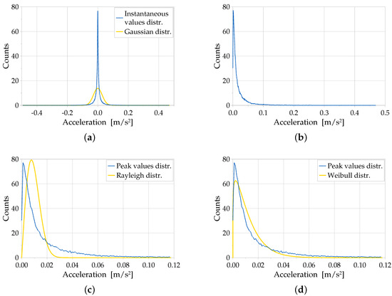 The distributions of the instantaneous, positive and negative peak values of the record are compared, respectively with the Gaussian distribution having the experimental RMS value and with the Rayleigh and Weibull distributions having the experimental median, to classify the statistical characteristics of the signals.