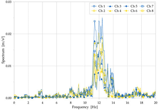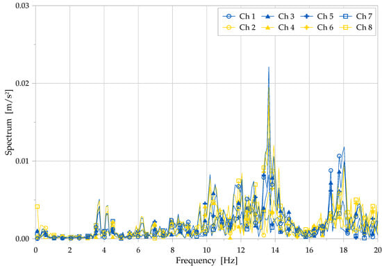 Significant and resuming obtained results are hereinafter reported, where the comments are to be considered common to all the devised channels, regardless of the span, unless explicitly stated. It is worth observing that the monitored vibration is quite similar throughout the whole record. Moreover, the amplitude of the recorded ambient vibration is characterized by a succession of beats, probably generated by regular operational traffic of the vehicles (including trucks) passing onto the bridge.