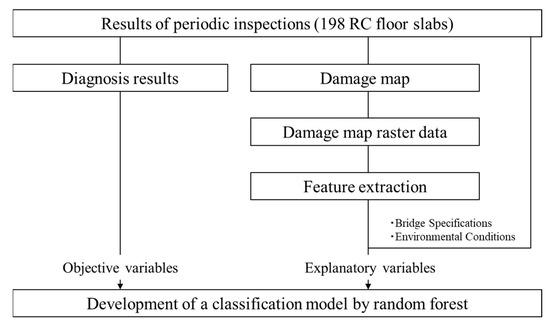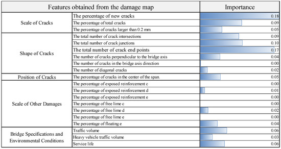 In this study, 17 features obtained from the damage map data and three indicators of bridge characteristics and environmental conditions are used as explanatory variables as shown in Figure 7, and the classification of floor plate cracks diagnosed by close visual inspection is used as the objective variable. In addition, the importance of explanatory variables is clarified, and the explanatory variables that affect the classification of measures are discussed.