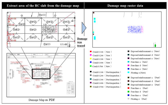 The damage maps were created by CAD and recorded and stored as PDF data. Therefore, damage raster data containing only useful information for diagnosis was created from the damage maps using the following procedure.