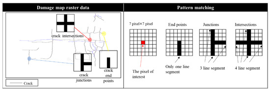 Figure 4 shows an example of the number of cracked intersections, junctions, and end points, and the judgment method. Pattern matching was used to determine the intersection, junction, and end points of the cracks. In pattern matching, pixels are checked systematically by moving a rectangular area of 7 pixel × 7 pixel against the damage diagram raster data. For the edge, the detection was based on the condition that the pixel of interest was traced by a crack and that there was only one line segment that reached the periphery. For intersections and junction points of the cracks, the number of pixels of the line segments where the pixel of interest is traced by the crack and exists in the periphery was used as a condition for detection.