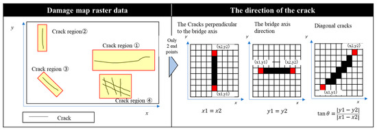 In this study, the direction of the crack is also considered as a feature that represents the shape of the crack. The calculation method for the crack direction is shown in Figure 5. As shown in the left side of Figure 5, all cracks in the damage diagram raster data are divided into contiguous individual crack regions (yellow rectangular regions in Figure 5). Extract the end points of the cracks (red pixels in the right side of Figure 5) from the divided individual crack regions by pattern matching. Only for the crack area with two extracted end points is the angle calculation process performed for the two points. The x-axis is the direction of the bridge axis, and the y-axis is the direction perpendicular to the bridge axis, and the coordinates of the two end points are (x1, y1) and (x2, y2). If the x-coordinates of the two points are the same, i.e., x1 = x2, the crack is perpendicular (90 degrees) to the bridge axis direction. If the y-coordinates of the two points are the same, i.e., y1 = y2, the crack is horizontal (0 degree) to the bridge axis direction and is considered to be a crack in the bridge axis direction. Otherwise, the tangent is obtained from the difference of x-coordinate (x1 − x2) and y-coordinate (y1 − y2) (tan(θ= |y1 − y2|⁄|x1 − x2|), and the angle is obtained. If the absolute value of the angle is less than 30, the cracks are counted in the direction of the bridge axis; if the absolute value is more than 60, the cracks are counted in the direction perpendicular to the bridge axis; otherwise, the cracks are counted as diagonal cracks. The number of cracks in the perpendicular direction, the number of cracks in the axial direction, and the number of diagonal cracks were calculated for each RC slab by judging all the cracked areas as perpendicular cracks, cracks in the axial direction, and diagonal cracks, and totaling the entire damage diagram raster data. In this study, three features, “the number of cracks perpendicular to the bridge axis”, “the number of cracks in the bridge axis direction” and “the number of diagonal cracks” were used as indicators of the crack direction.