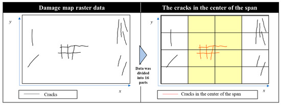 The position of cracks can be a factor affecting diagnosis. In this study, in order to take into account the characteristic value that represents the position of crack occurrence, the damage map raster data was divided into 16 parts as shown in Figure 6, and only the number of pixels of cracks that exist in the 8 meshes in the center of the fulcrum was counted. This value was divided the total number of pixels in the damage map raster data and multiplied by 100 to obtain “the percentage of cracks in the center of the span”.