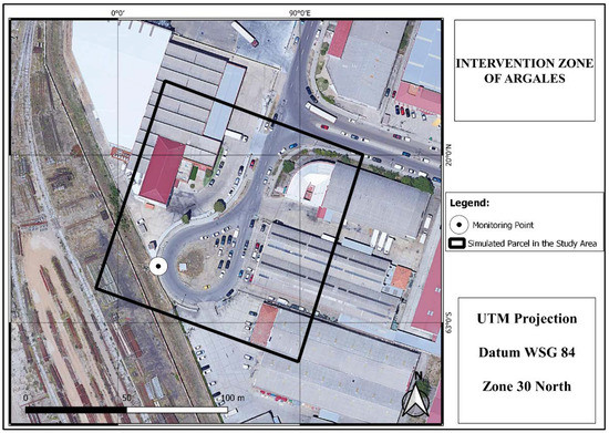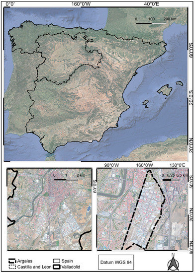 This study takes place in Valladolid, the capital of the Spanish region of Castilla and Leon. It has approximately 300,000 inhabitants and covers over 200 km2 [46]. It has a diversified urban fabric [47], with industrial spaces close to the urban core, as is an industrial tradition [48]. The study area is located within the Argales Industrial Park (Figure 1), an area with a high concentration of industrial and commercial buildings, with vast impermeable areas and no public green spaces.