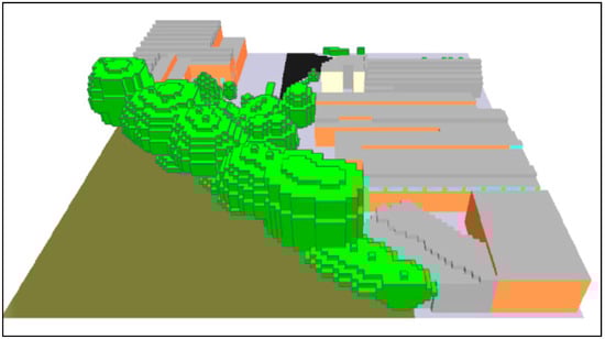 After integrating the 2D model inputs, ENVI-Met provides a 3D representation that allows the visual representation of the study area (Figure 3). With this 3D model validated, and considering the meteorological data input, ENVI-Met simulates the conditions for the given date and meteorological conditions.