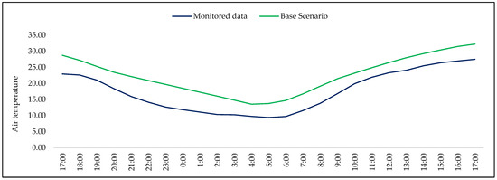 The microclimatic monitoring provided the air temperature profile over a 24 h campaign (Figure 5). These data were used as input to perform the simulations for both the base and the NBS scenario. The results show that data from the simulation overestimate the air temperature when compared to local measurements, and this difference can be justified by the use of the simple forcing method, in which the program forces the behavior of the climatic parameters during the day across the simulation area, not only including the data collection location, based on their maximum and minimum values used for the simulation input [52,53]. Nonetheless, the data follow a similar profile to the Pearson correlation between the two datasets, which is strong (0.777).