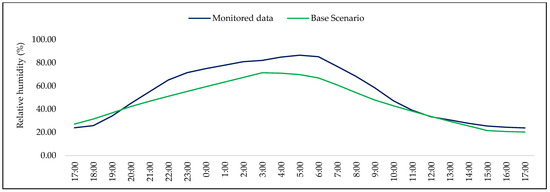 Monitored and simulation relative humidity (Base Scenario) at the monitoring location.