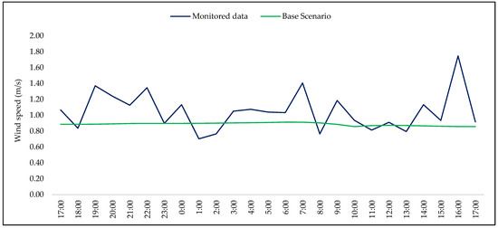 Wind speed can have a major influence on the behavior of air temperature since it can affect dynamic processes such as convection. Figure 7 presents the variation of data from the two datasets: monitored and simulated (base scenario). The wind speed averages were used in the simulation of the base scenario and the scenario with the NBS.