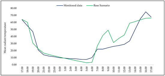 Mean radiant temperature is a parameter influenced by surfaces’ albedo and by the shading from both buildings and trees. Its behavior changes throughout the day as a consequence of the solar radiation load [31]. The analysis between the monitored data and the baseline scenario simulation demonstrates that there was a similar MRT behavior at the pedestrian level (1.5 m above ground) for the measurement period (Figure 8).