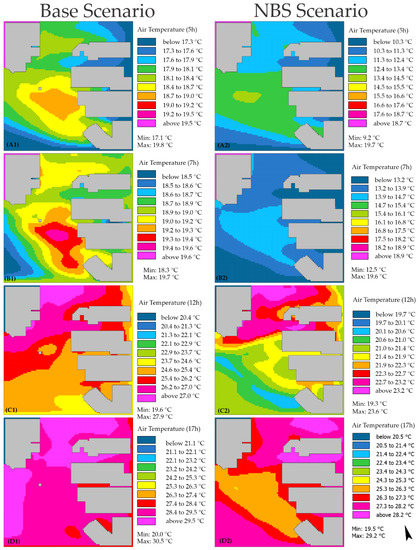 Simulated air temperature for the base and NBS scenarios. Hours: (A1,A2), 5 h; (B1,B2), 7 h; (C1,C2), 12 h; (D1,D2), 17 h.