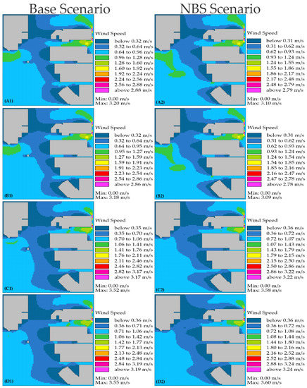Simulated wind speed for the base scenarios and scenarios with NBS interventions. Hours: (A1,A2), 5 h; (B1,B2), 7 h; (C1,C2), 12 h; (D1,D2), 17 h.