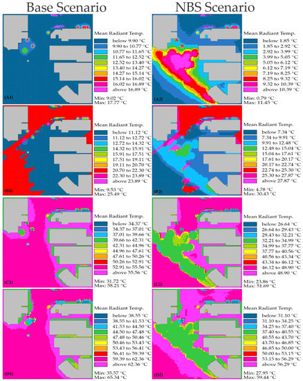 Simulated mean radiant temperature for the base scenarios and scenarios with NBS interventions. Hours: (A1,A2), 5 h; (B1,B2), 7 h; (C1,C2),12 h; (D1,D2), 17 h.