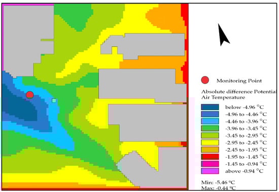 Simulations were performed in ENVI-Met for air temperature (Figure 9). For this parameter, hourly maps were generated for 5 h (just before sunrise, with the lowest air temperature value), 7 h (just after sunrise), 12 h (noon, with the highest solar angle) and 17 h (mid-afternoon). The height considered for reading the model data was 1.2 m.