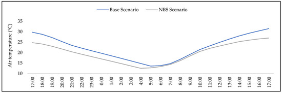 Overall, the base scenario had ranges of 2.7 °C, 1.4 °C, 8.3 °C and 10.5 °C for the simulated times of 5 h, 7 h, 12 h and 16 h, respectively. For the same periods, the simulations for the NBS scenario foresaw amplitudes of 10.5 °C, 7.1 °C, 4.3 °C and 9.7 °C, respectively.