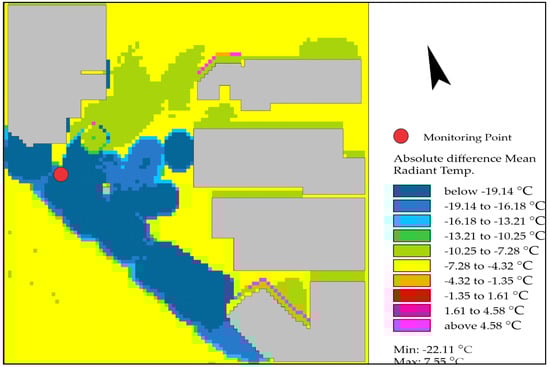 In this study, mean radiant temperature (MRT) is the parameter proportionately most affected by the shadows cast by trees and buildings [33]. The simulations (Figure 11) demonstrate how this variable changed at the pedestrian level (1.2 m) for the four simulation periods, for both the base and NBS scenarios.