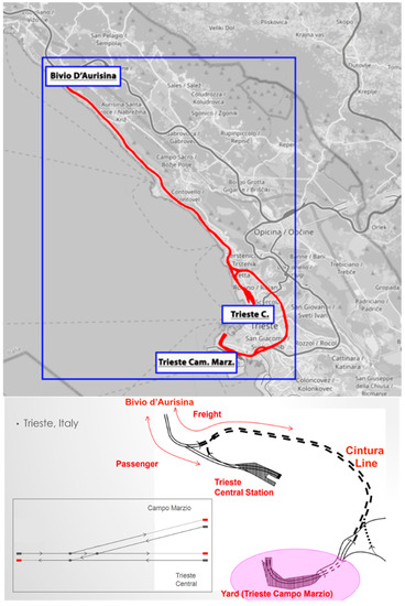 In this operational context, the passenger trains departing from Trieste Centrale meet the freight trains from Trieste Campo Marzio station at the Barcola Junction and continue along the double-track line toward Bivio D’Aurisina as Figure 1, and the capacity depends on various parameters, classifiable into two groups: