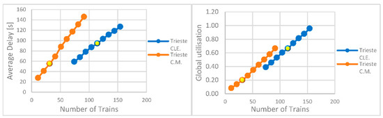 Figure 2 shows the Trieste Centrale (in blue) and Trieste Campo Marzio (in red) average delay/train generated by a variable amount of running trains and the global utilization rates corresponding to them according to the increase of traffic. The yellow circle is showing the present number of trains in both directions for each station.