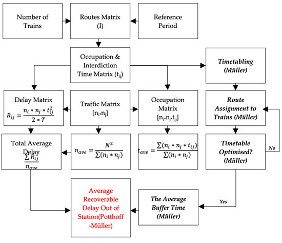 The Potthoff method includes combinatorial procedures able to quantify the utilization rate of single routes, station areas and the station as a whole. This method assumes that trains could arrive at any instant with the same probability within the reference time T; therefore, it does not require an assigned timetable, which simplifies its application [54]. The application considered the following hypothesis:
