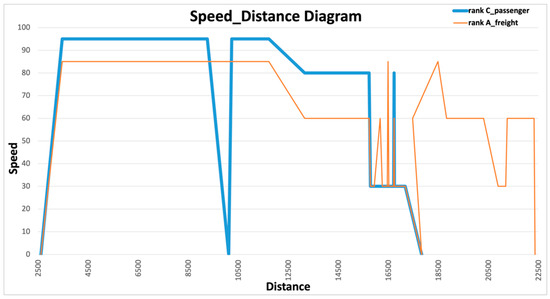 Figure 4. Speed–distance diagram for Trieste Centrale in blue, and Trieste Campo Marzio in red. - Second Type of occupation method is based on the default brake curves setting;
