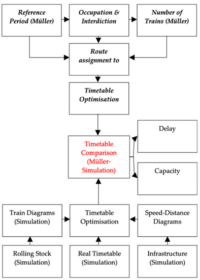 The focus of the comparative analysis is to identify conflicts and delays as a difference between simulated and planned timetables, by identifying the potential bottlenecks and finally mitigating the conflicts and minimizing the delays. The stepwise structure proposed method is in Figure 5, (in brackets the sources of the results).